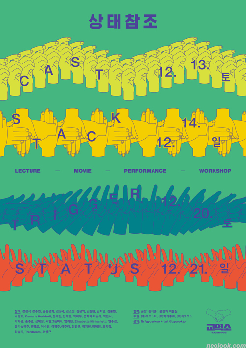 교역소에서 열린 《상태참조》(2014) 포스터. 출처=https://neolook.com/archives/20141213b 극단적으로 퍼포먼스만으로 이뤄진 전시를 생각해보자. 화이트큐브를 진공으로 두거나 시작부터 극장의 블랙박스를 전유할 수도 있다. 예전 교역소의 《상태참조》나 《퍼폼》은 애초에 퍼포먼스를 위해 한시적으로 전시 형태의 공간을 구성하고, 퍼포먼스 자체만을 위해 공간(=시간)을 여는 식으로 진행되었다고 할 수 있다. 따라서 퍼포먼스는 단판 승부가 된다. 여기서 한 가지 조건을 생각해 볼 수 있는데, 한정된 자원의 집중을 추구하는 것은 스펙터클을 위한 물량 공세와도 연결되지만 동시에 물질적 조건에서의 자유로움과 연동된다는 점 역시 생각해볼 수 있다.