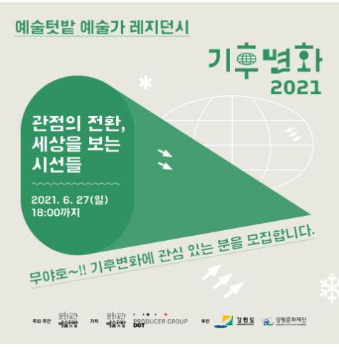 예술텃밭 예술가 레지던시-기후변화2021 포스터. 얼마 전에는 강원도 화천의 한 레지던시 시설을 방문했습니다. 극단 뛰다가 운영해 온 공간이었습니다. 화천은 홍천보다 위쪽에 있고, 화천과 홍천 중간쯤에 춘천이 있습니다. 1박 2일로 그곳에 있었는데, “예술텃밭 예술가 레지던시-기후변화2021”17이라는 거기서 열린 행사가 종료된 후, 레지던시 측에서 마련한 음식들로 꾸린 뷔페를 나눠 먹고, 그 앞 야외에서 모닥불을 쬐며 옹기종기 예술가들과 기획자들과 앉았습니다. 새벽 2시가 넘도록 사람들은 한 명도 자리를 뜨지 않았습니다. 10시쯤 시작한 잡담이 장장 네다섯 시간 계속되었습니다. 그날은 그곳 레지던시가 종료되는 날이기도 했습니다. 5개월 정도 작가들이 이곳에 일정 기간 모여 워크숍을 하고 논의하고 하는 공동의 기간과 개인 리서치를 하는 시간이 마무리되는 날이었습니다.