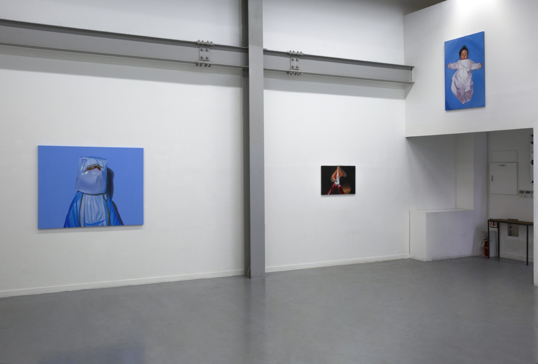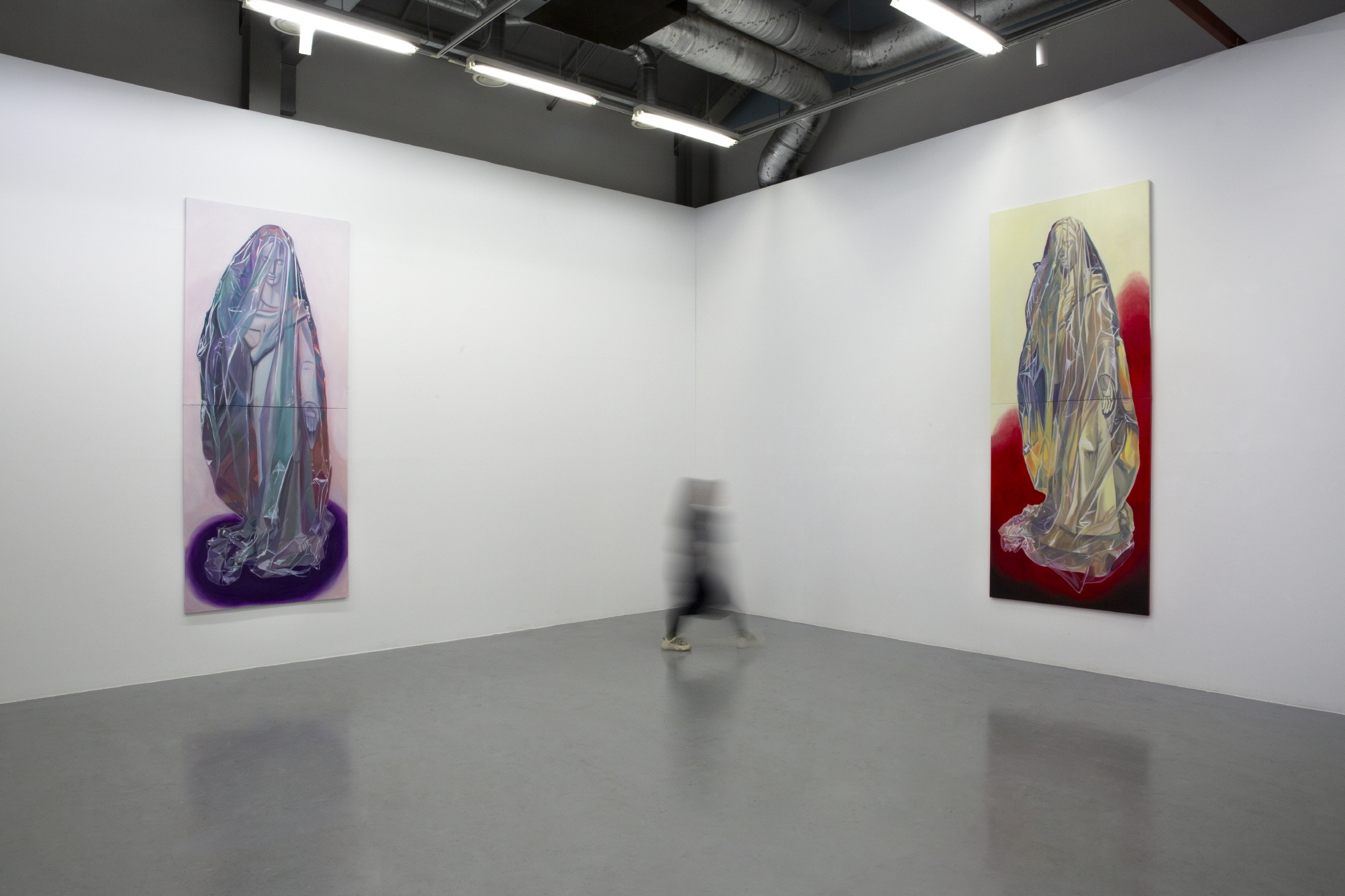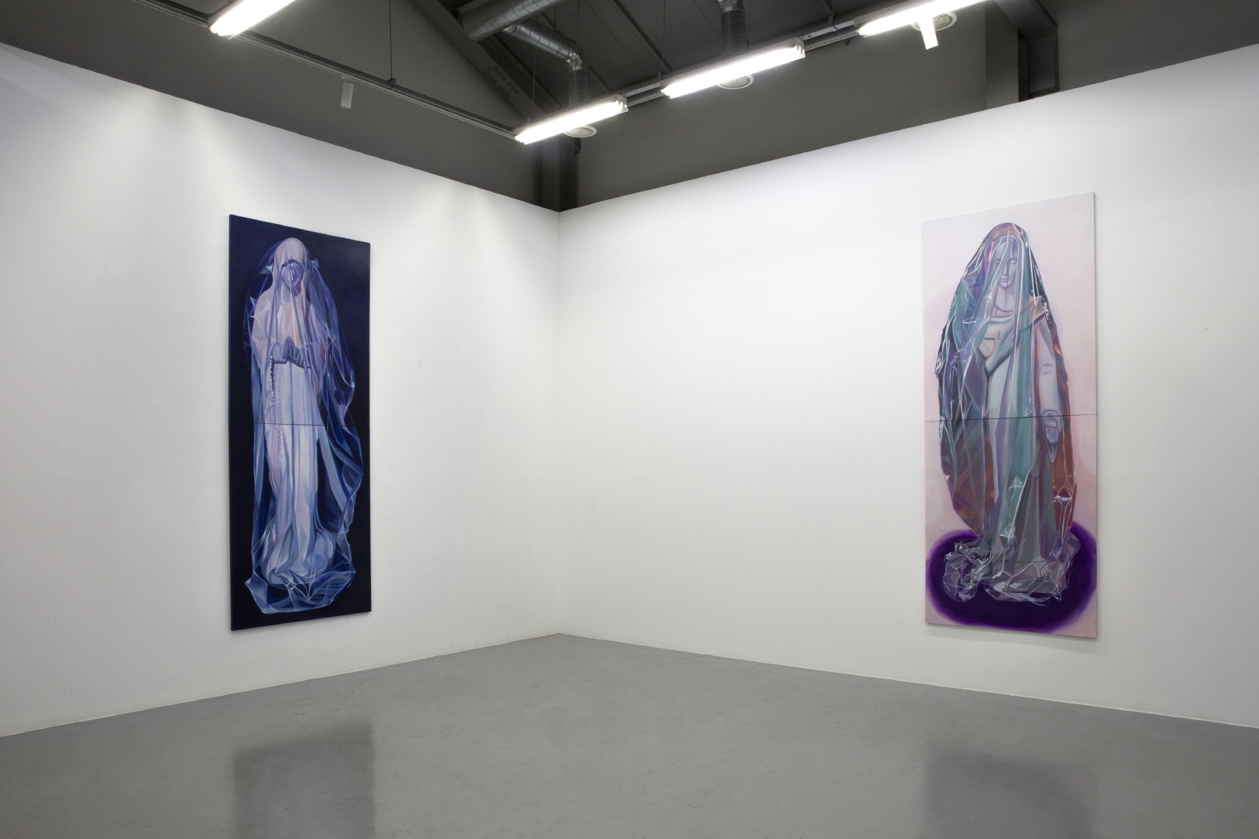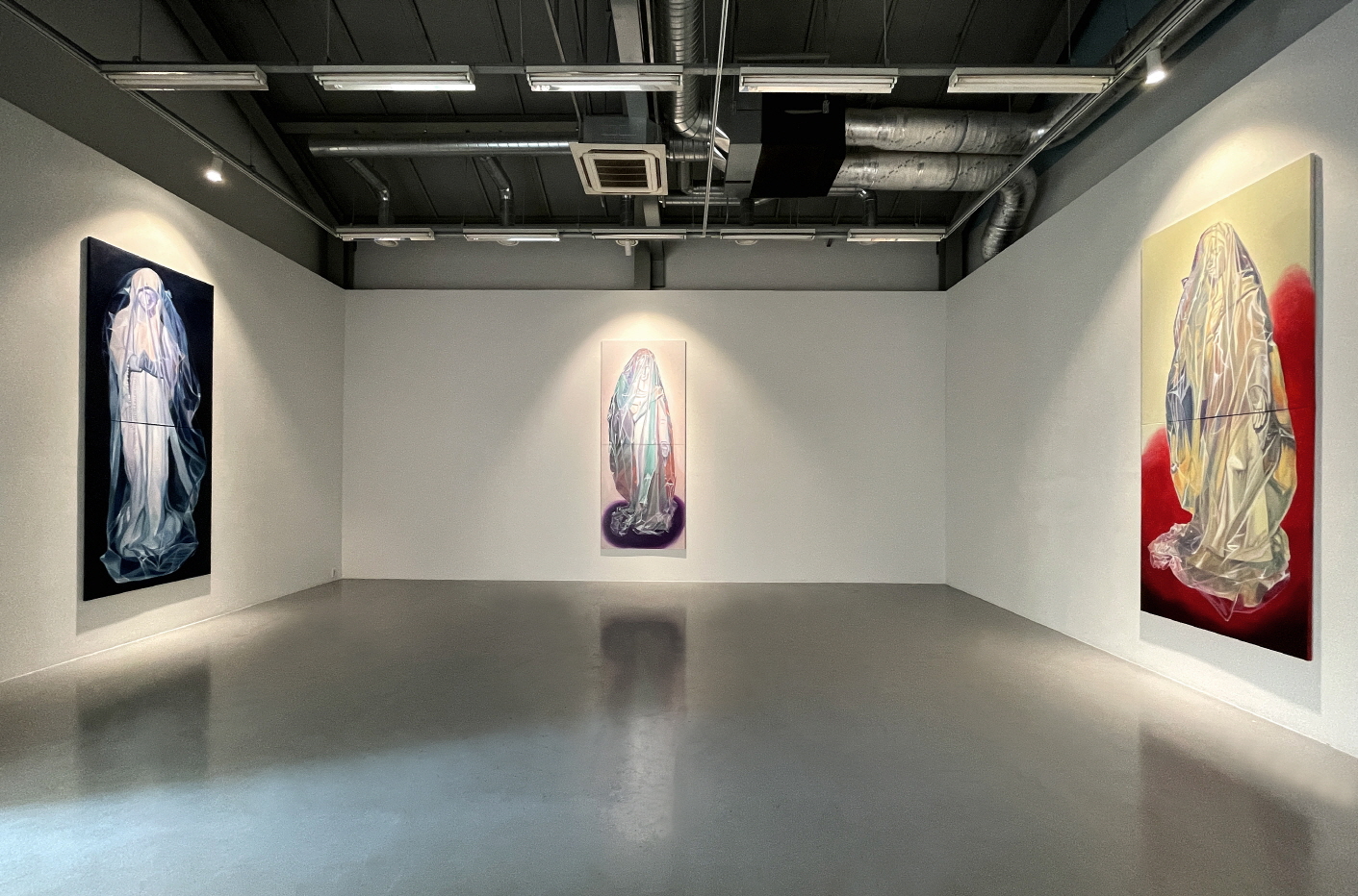 ▲ 희박. 《썩지 않는 금은 없다》 전시 전경, (사진 왼쪽부터) 〈Prussian〉(2025. 캔버스에 유채, 325×130.3cm.), 〈Pink to Purple〉(2025. 캔버스에 유채, 325×130.3cm.), 〈Butter〉(2025. 캔버스에 유채, 325×130.3cm.)[사진=작가 제공]. 희박 작가의 《썩지 않는 금은 없다》는 일곱 점의 회화로 구성되며, 작은 큐브의 공간으로 높은 천장고에 상응하는, 비닐에 싸인 바뇌의 성모를 그린, 세 개의 대형 작품과 상대적으로 작고 다양한 주제의 네 작품이 있다. 중심 도상인 성모를 비롯한, 하나의 공통된 토대는 배경이다. 배경에는 어떤 사물도 없고 일정한 톤을 형성한다―〈축하 케이크 Celebratory Cake〉(2025. Oil on canvas, 65.1×90.9cm.)는 그 예외이며, 예외성은 또한 전시장 바깥의 윈도우에 따로 전시되었다는 것으로 발현된다. 배경은 첫 번째로 피사체가 자리한 현실을 지우거나 축소하거나 은폐하며, 두 번째로 그 현실이 자리한 시간성을 소거한다.
