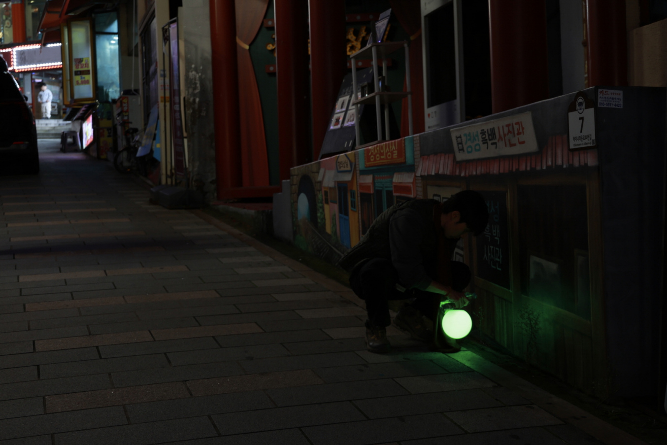 이 떠다니는 입자들로서 연결되는 집단은 지역 내의 개별 주체의 서사를 미미한 움직임과 관계의 정동으로 바꾸는데, 움직임의 우태욱과 사운드의 타무라 료는 그 경계의 한 축을 이루는 배경적 기능을 한다. 가장 주요하게 공연 전반을 잠식하지만, 그것이 서사의 일면을 가시화하거나 고유한 역할로 정체화되지는 않는다. 이들은 이동의 표지이자 이 집단을 엮는 매개항에 가깝다. 아마 가장 긴 시간 걸었을 미얀마 거리 이후의 부평공원에서는 나뭇가지를 건네거나 메마른 잎사귀 표면이나 물 묻은 잎을 감촉하게 하거나 하는 관객과의 상호작용이 제일 많이 일어나는데, 그것은 이 풍경을 다소 증폭시켜 지각케 하는 부분으로, 이로써 퍼포머들은 가시화되기보다 이 풍경을 일정 부분 빌려옴으로써 매개하는 역할에 전적으로 머문다.