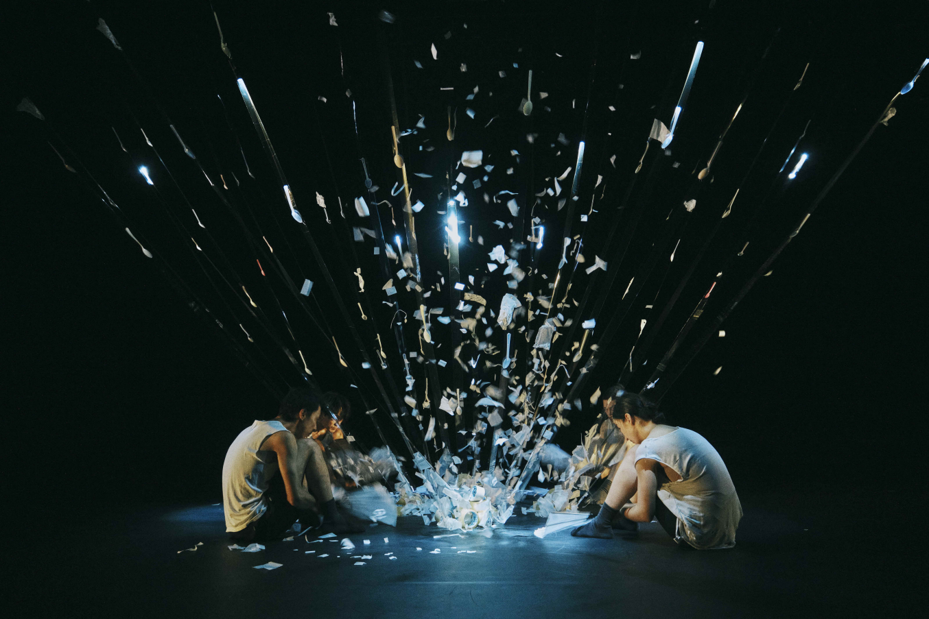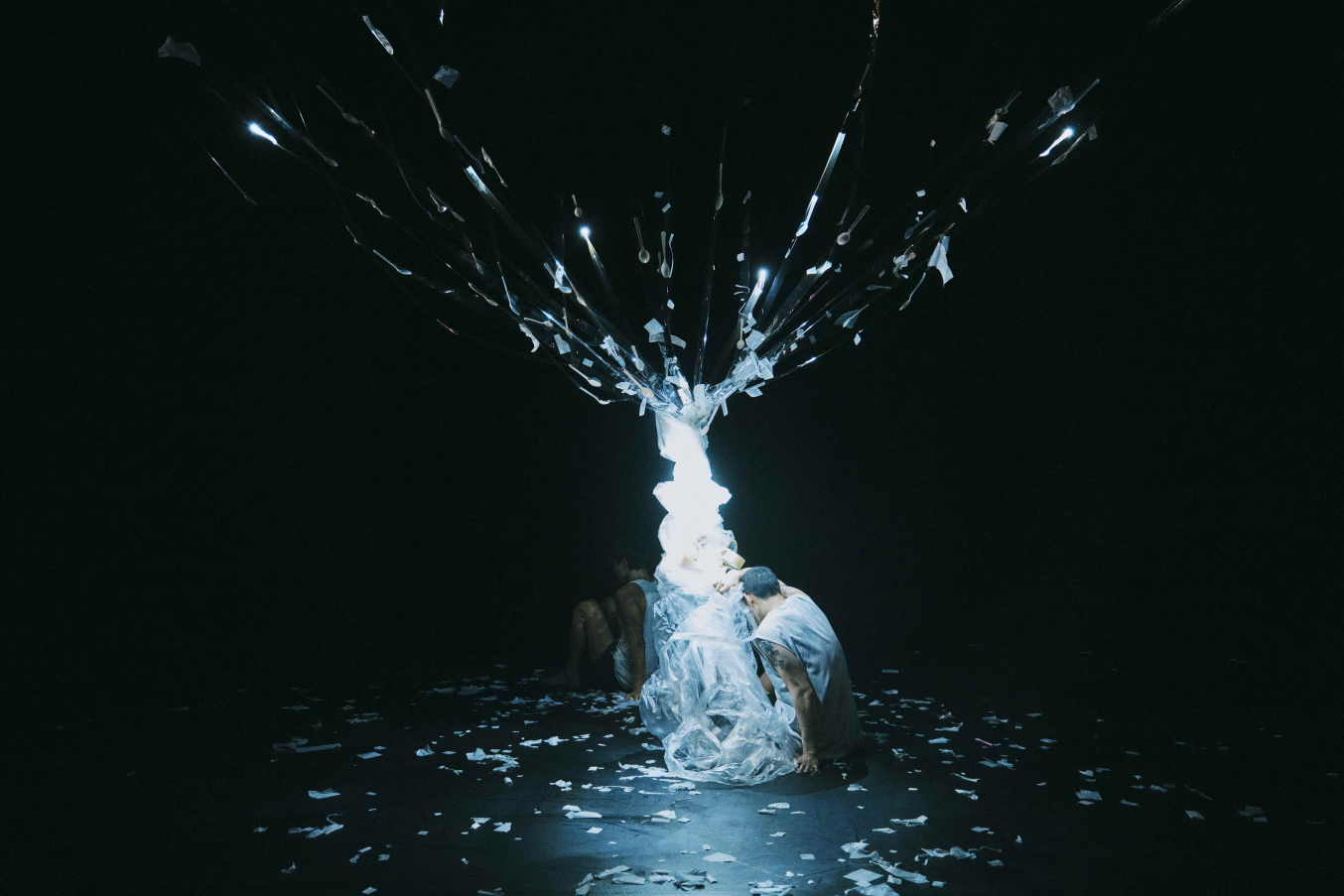 여자의 재등장 전까지 두 남자는 하나의 존재로 갈음(되어 오지각)된다. 마치 비닐 안 조명으로부터 자신 너머 형성된 그림자를 마주한 한 남자의 좌선이 동굴 안에서 일어나고 있다는 환상을 형성한다. 그것이 두 존재로 구분되며 하나의 평평한 세계에 이르게 되는 건 첫 번째는 앞을 분간할 수 없게 했던 조명의 낮아짐, 그리고 두 번째로 여자의 물리적 개입에 따른다. 나의 잔여로서 뒤의 환각, 또는 그 반대의 차원에서 잔여로서 앞의 환각, 그 중첩과 경계의 차원에서 하나의 신체를 오가던 것이, 곧 바닷속과 같은 미지의 공간 안의 신비로움으로 응결되는 상황―스펙터클 안의 존재―이 조명의 변화에 따라 실체로 분별되며 분리되고, 방울의 울림과 함께 ‘셋’의 현실적 지형으로, 바람을 불어넣는다는 물리 작용의 순수 몸짓―스펙터클을 만드는 셋의 분주한 작용―으로 ‘비닐’ 안의 사투로 완전히 변환되는 것이다.