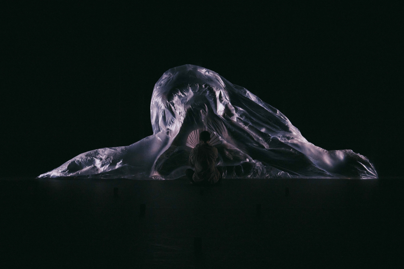 두 남자가 정좌한 무대 안쪽에서 양쪽 가로부터 붙여 나간 비닐을 들어 올리고 거기에 부채로 바람을 불어넣자 순식간에 그것은 “방울산”으로 증폭한다. 두 남자 사이에 여자가 서서 부채질을 하며 종을 울리는데 이는 후반부의 뒤늦게 나타나는 장면이다. 소리의 “파동”이 산으로 체현된다―사이이자 그 횡으로 위치한 여자와 남자의 합성은 “피에타”로 볼 수 있을까. 남자들의 부채질이 이 거대한 비닐의 파형 작용을 일으키는 차원의 기능적인 부분이라면, 여자의 부채질은 종의 울림을 만들기 위한 움직임에 부속되며, 그 바람은 자신의 실루엣을 비닐의 경계로 옮기는 순간의 반대 방향에서 그 실루엣을 희미하게 하는 작용, 곧 그 비닐 ‘안‘의 차원에 그녀를 위치시키는 차원으로 특정된다.