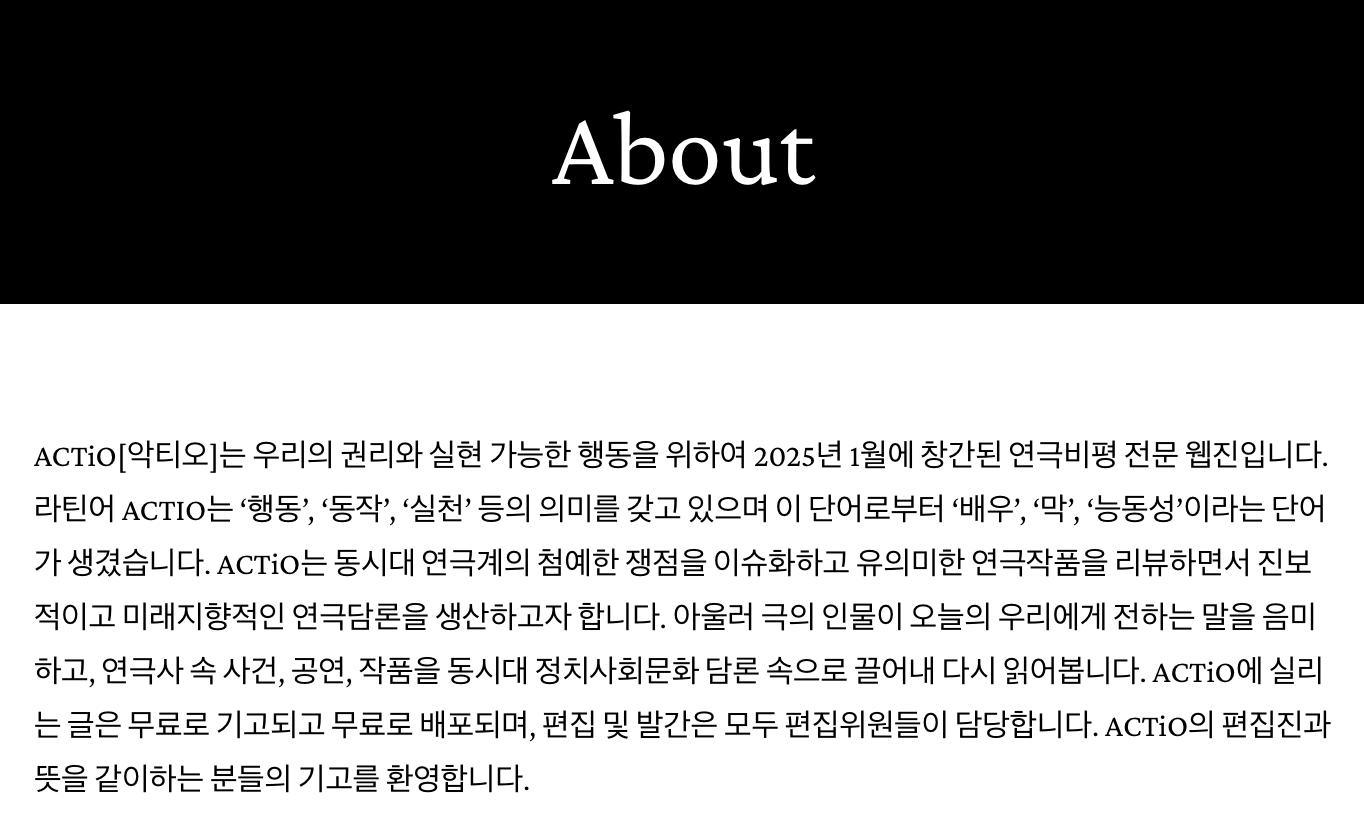 《악티오》 홈페이지에서, 《악티오》에 대한 소개 문구[이미지=홈페이지 캡처]. 출처=https://actiowebzine.com/about/ 다른 한편으로, 이 《연극in》의 부재 너머에서 빠르게 시급한 현장의 목소리를 반영하는 플랫폼이 민간에서 만들어졌는데, 이는 《연극in》의 부재를 대체(할 수 있음을 증명)한다기보다는 결국 공론장이 일정한 ‘관리’의 영역으로 소급될 수 없다는 지점, 그리고 그 관리로 인해 비로소 존재할 수 있었다는 지점을 동시에 이야기하는 데 가깝다―《연극in》의 사태는 결국 그것이 행정적인 차원에 한정된다고 해도 공공영역의 일정한 관리 아래에서만 그 플랫폼이 작동되고 있었음을 드러낸다.