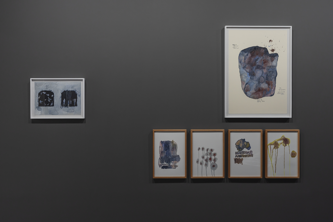 종합하면, 과슈의 매트한 발색은 작가 손의 소근육 감각을 떠받쳐짐의 사태로 인도하고, 작가 손의 소근육 감각은 과슈의 매트한 발색을 내는 데 기꺼이 그 위의 떠받쳐짐의 표면과 같이 물화된다는 것이다. 또한, 매트한 발색은 하나의 시작으로서 배경과 그 안에서의 점증되는 시간으로서 고임으로 연장되는데, 이때 하나의 표면이 다른 하나의 표면을 또한 담는다, 또는 떠받친다. 아마도 이 지점에서 신체와 그림의 혼동 혹은 중첩에 대한 은유가 가능하지 않을까. 또는 의도되고 있던 것은 아닐까.