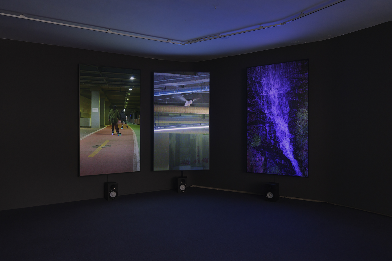 〈폭포와 희열〉(2025. 3채널 비디오 설치, 4K, 컬러, 사운드, 14분.) 우선, 영상 〈폭포와 희열〉(2025. 3채널 비디오 설치, 4K, 컬러, 사운드, 14분.)은 낮과 밤이라는 자연의 거대한 시간 체제 아래 진행되며, 세 가지 장소를 절합한다. 강변이 사람들의 여러 모빌리티 양상을 좇는다면, 굴다리는 새와 인간의 절합된 삶의 분포로 재산출되고, 인공 폭포 앞은 수많은 다양한 인간 존재들의 행위 양식으로 연기된다. 높이가 긴 영상에 맞춰 세 개의 세로로 놓인 패널이 나란히 있고, 여기서 낮과 밤의 변경만이 작동하는 일관된 변화로 고착된, 거꾸로 흐르는 폭포의 영상이 제일 오른쪽을 차지한다―그 앞쪽에 놓인 스피커들과 별개로, 전시장에서 오른쪽으로 끝까지 뻗어 나간 장소에 걸린 스피커가 이 소리와 따로 동조되는데, 그럼으로써 폭포에 둘러싸여 있음의 감각이 만들어진다, 이 주조음으로 파생되는 영상의 지배적 지위를 물리적으로 인계하면서 말이다.