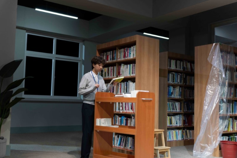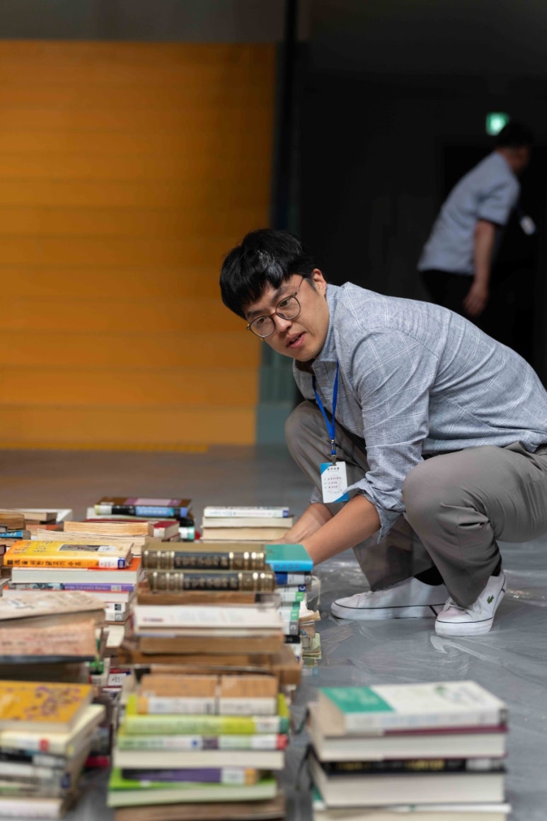 강현주 작/연출, 〈사사로운 사서〉[사진 제공=국립아시아문화전당](이하 상동). 북부 도서관이라는 가상의 실재하는 도서관의 사서들을 중심으로 진행되는 〈사사로운 사서〉는, 도서관 일부를 그대로 옮겨 놓으려 한 무대 세트의 배경 아래, 도서관의 일상 업무의 세부적 요소를 바탕으로 한 대화의 시작으로써 극사실주의적 토대를 마련한다. 물론 이는 일차적인 것이며, 장마 기간의 엄청난 비로 인해 발생한 지하 보존 서고의 침수 피해로부터 책 복원 작업이라는 비일상적 차원의 특수한 업무의 긴급한 미션이 사서들에게 주어지며, 이는 책과 이들의 관계성을 묻고 책을 매개하고 다루는 이들로부터 어떻게 책 자체가 세계를 마주하는지, 나아가 세계를 반영하는 메타포로서 확장된 책의 모습이 펼쳐진다.