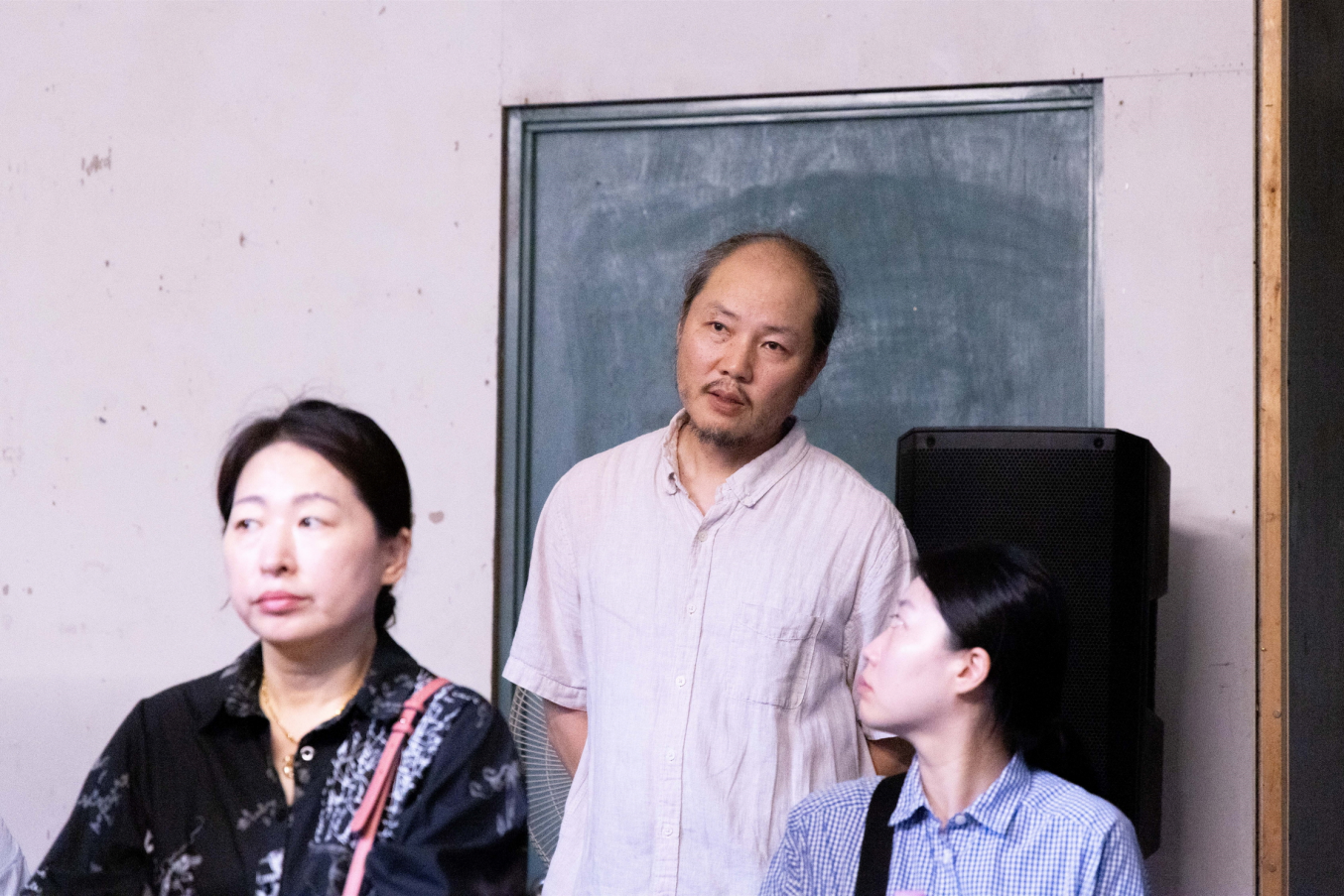 공간을 휘저으며 객석에서 나타나는 두 사람은 각각 “이렇게 덥지만” 우리가 희망을 갖고 바깥으로 나가야 한다라는 의견(하준호 배우)과 “이렇게 더운데” 이곳에 머물러 있는 게 더 낫다라는 의견(최요한 배우)으로 극명히 나뉜다. 이들은 우리를 대리 표상하는데, 바깥이 안전하지 않기에 안에 있어야 한다라는 것과 안에서 언제까지 생존이 담보될 수 없고 바깥이 안전하다면 나가야 한다라는 것은 곧 이 장소를 포함한 시대적 상황의 불완전함을 가리킨다, 또는 그 불완전함으로(만) 환원된다. 공간 안에 숨는 것과 공간 안에 갇히는 것의 두 대립적 표상 아래, 문밖의 세계는 알 수 없는 곳으로 현상된다. 곧 이들의 대화는 문 바깥의 세계로 모든 것이 환원되는 구심점을 만든다.