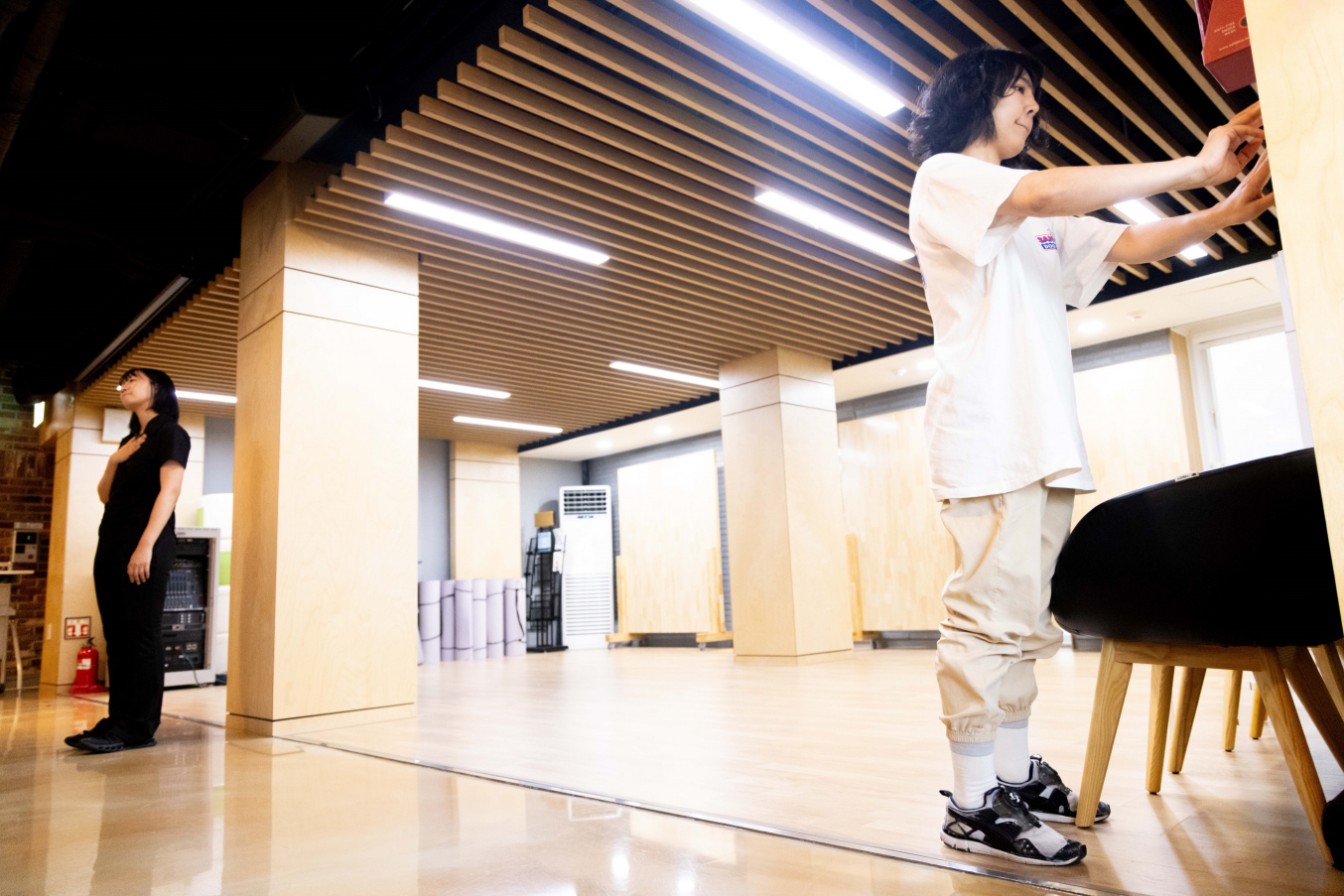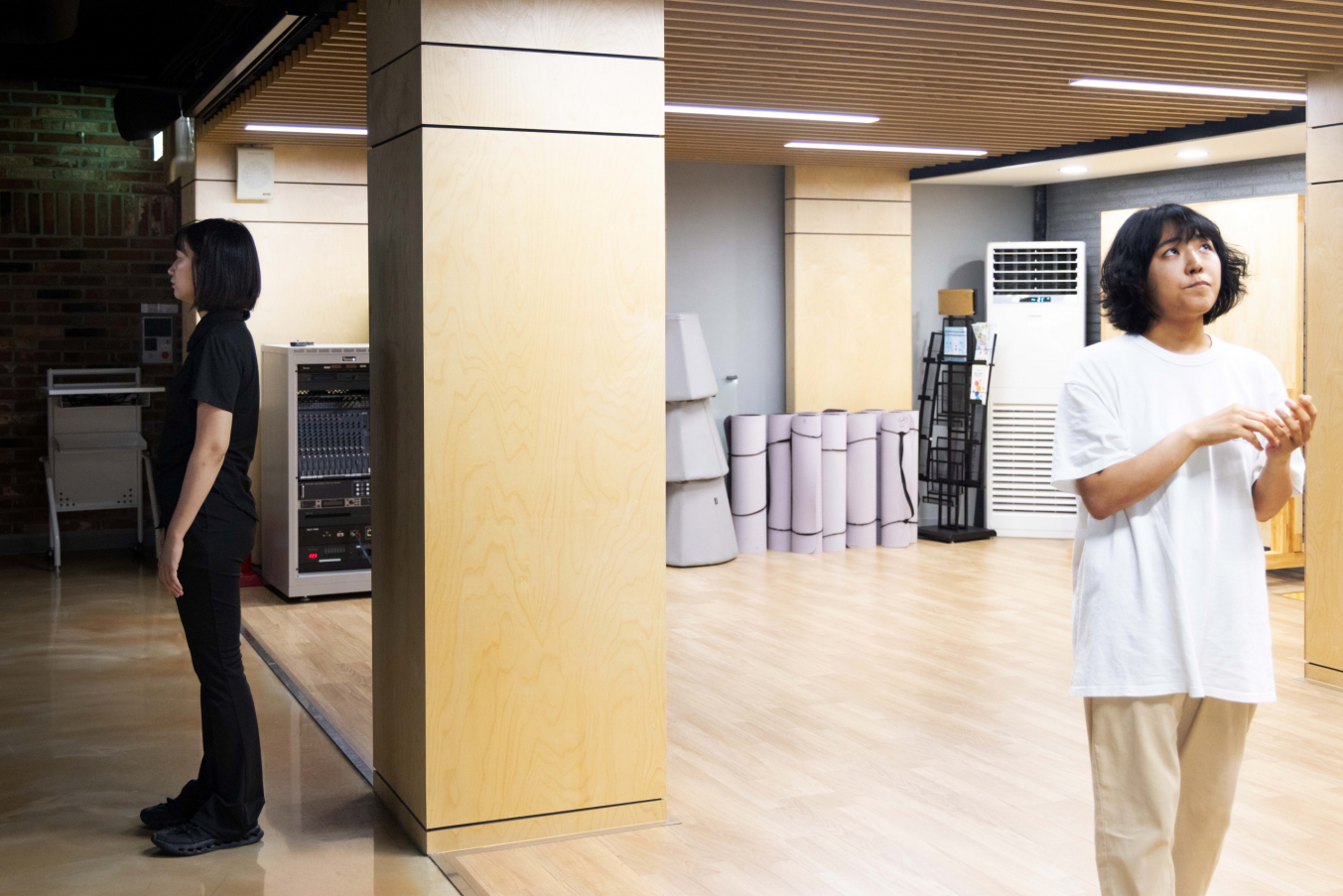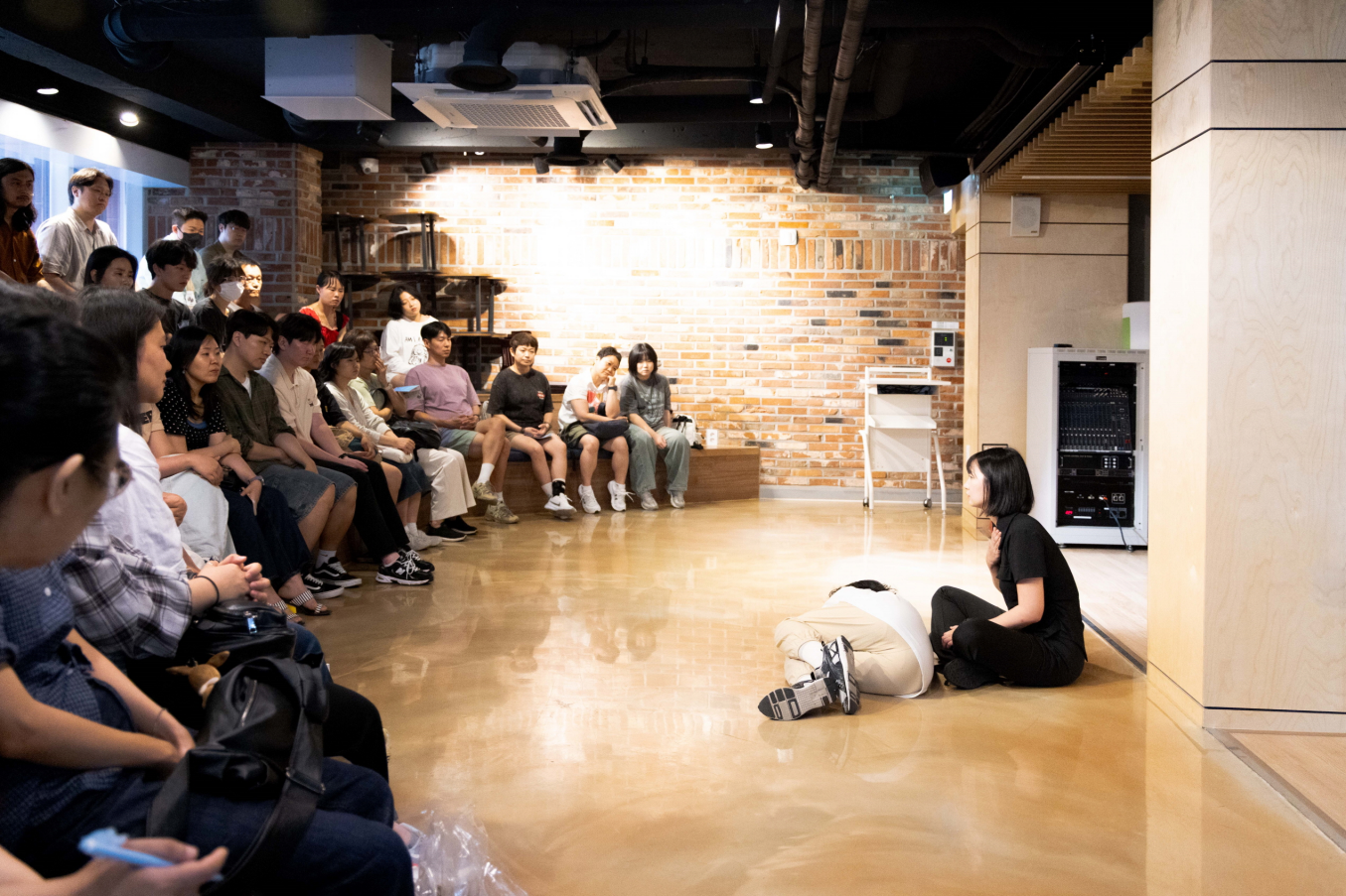 그 말은 희미한 명확함이다. 미세한 각도의 전환은 그 소리-공간의 범위를 완전히 변화시킨다. 그것은 점차 들릴 수 있는 것으로 바뀐다. 하지만 언제까지나 새어 나오는 것으로서 머문다. 그 신체가 새겨진다. 그 신체가 새겨지는 공간으로 우리는 좁혀진다. 우리는 좁혀지며 새겨진다. 그의 숨이 뱉어지고 도달하는 공간에 우리는 머문다. 그만큼의 공간으로 우리는 물리적으로 수축된다. 우리는 앉아있지만 우묵해짐을 수행한다. 이러한 운동성 속에 극장은, 공간은 하나의 신체에 대한 반향으로서만 딱 그만큼씩만 채워진다. 신체는 곧 말이고, 말은 곧 숨이고, 숨은 곧 공간이다. 신체와 말과 숨과 공간이 교환된다. 그 교환 과정 아래 놓인다. 현존은 하나의 공간에 배우만 나타날 때를 의미한다. 아니다. 현존은 배우가 하나의 공간이 됨을 의미한다. 아니다. 현존은 그 배우가 하나의 공간이 될 때 그 공간 안에 내가 놓여 있음인 것이다. 공간에 붙들려 있는 건 바로 나이다. 그것이 현존이다.